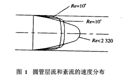 不同流動(dòng)狀態(tài)的水泥漿液流經(jīng)流量計(jì)測量管時(shí),管內(nèi)圓截面上會呈現(xiàn)不同的流速分布(見圖1),即: 層流的流速變化是拋物線分布,在管中心軸上流速*大,且雷諾數(shù)變化、流速分布形態(tài)不變;紊流時(shí),流速分布在測量管內(nèi)壁的近旁比層流流速大,在中心部比層流時(shí)流速小,且流速分布形態(tài)隨雷諾數(shù)的變化而變化。