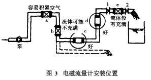 水平安裝時(shí)要使電極軸線平行于地平線,因?yàn)樘幱诘撞康碾姌O易被沉積物覆蓋,而頂部電極易被液體中偶存的氣泡擦過遮住電極表面,使輸出信號波動(dòng)。例如圖3所示管系中,c和d為適宜位置;