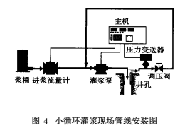 小循環(huán)灌漿法的實(shí)質(zhì)是: a泵的吸入量主要由返漿量提供,返漿量的大小由高壓調(diào)節(jié)閥控制,鉆孔灌漿注入量=流量計(jì)量(見圖4);b流量計(jì)大部分時(shí)間工作在1/3量程之下,相當(dāng)長的時(shí)間內(nèi)工作在1L/min左右;c返漿漿液不返回?cái)嚌{桶,水泥漿液只能在閉合的管道中循環(huán),漿桶內(nèi)調(diào)節(jié)水灰比對灌漿漿液的密度影響甚微。