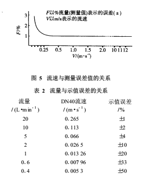 由EMF的測量原理可知,其流量的下限由同噪聲或偏移的信噪比S/N 來決定,其上限則由測量管內(nèi)襯里的磨損和配管的經(jīng)濟(jì)速度等來決定。一般當(dāng)測量管內(nèi)實(shí)際流速小于0.1m/s時(shí),感應(yīng)電動(dòng)勢已變得十分微弱(幾微伏至零點(diǎn)幾微伏),此時(shí)噪聲的影響逐步變?yōu)橹鲗?dǎo),甚至淹沒信號電動(dòng)勢。其流速和測量誤差的關(guān)系詳見圖 5和表2。