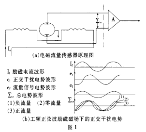 工頻干擾噪聲是由電磁流量傳感器勵磁繞組和流體、電極、放大器輸入回路的電磁耦合,其二是污水流量計工作現場的工頻共模干擾,其三是供電電源引入的工頻串模干擾等,其產生的物理機理均是電磁感應原理。*先就電磁流量傳感器勵磁繞組和流體、電極、放大器輸入回路的電磁耦合產生的工頻干擾對污水流量計工作影響*大,而且在不同的勵磁技術下其表現的形態(tài)、特性不同,因而采取抗干擾措施也不同,電磁流量傳感器原理見圖1(a) 。在工頻正弦波勵磁磁場下,此種電磁耦合工頻干擾噪聲表現形式為正交干擾(見圖1b),又稱為變壓器電勢,其特點是干擾噪聲幅值和工頻正弦波勵磁頻率成正比,相位滯后流量信號電勢90°,且幅值較流量信號電勢大幾個數量級。