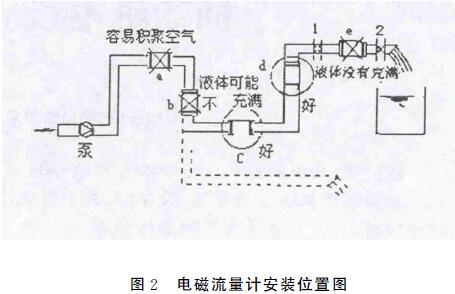 3.2.4對(duì)于電極可拆卸的儀表在安裝時(shí)方向錯(cuò)誤。部分污水流量計(jì)的電極并非安裝在表體測(cè)量管壁上,而是與表頭一體并可拆卸,在安裝時(shí)要注意兩個(gè)電極的連線應(yīng)與液體流向保持垂直。3.2.5液體未充滿管道,電極之間含有氣體。管道未充滿液體主要是管網(wǎng)工程設(shè)計(jì)或儀表安裝位置不當(dāng),使傳感器測(cè)量管內(nèi)不能充滿液體。應(yīng)避免安裝如圖所示a、e的位置和以虛線管排放時(shí)b位置,改裝到c,d位置較好。水平安裝時(shí)應(yīng)使電極的連線保持水平,如果電極一上一下,下部電極會(huì)由于介質(zhì)內(nèi)雜質(zhì)沉淀覆蓋電極,上部電極會(huì)由于氣泡堆積造成電極與介質(zhì)絕緣。垂直安裝時(shí)應(yīng)裝在流體自下而上流動(dòng)的管道上,這樣更容易使液體充滿管道。