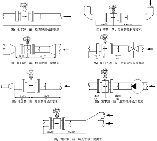 上述2、3、4項情況,流量計上、下游須裝異徑管。異徑管中心錐角應(yīng)不大于15°,且異徑管上游至少有5倍工藝管道直徑的直管段。