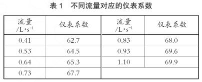 其中自變量為流量,因變量為儀表系數(shù)。當流量介于0.4~1L/s時,采用式(1)進行計算;當流量超過1.1L/s時,保持儀表系數(shù)恒為69.9。