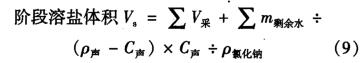 式中:V,為日溶鹽體積,m3; VA為日采鹽體積,m3 ;場余為腔體擴(kuò)大后未排出液體的溶鹽體積,m3 ; Vip1*a為腔體擴(kuò)大后未排出液體體積,m3m剩赫為腔體擴(kuò)大后未排出的液體中等效淡水溶劑質(zhì)量,kg;V排-為日排出液體體積,m3m瑰為日注人液體體積,m3; C排為日排出液體氯化鈉質(zhì)量體積濃度,歲1; C排-為日注人液體氯化鈉質(zhì)量體積濃度,g/l;C注為日排出液體密度,kg/m3 ; p注為日注人液體密度,kg/m3,P氯化鈉為氯化鈉密度,kg/m3 ; p水為水的密度,kg/m3 ; V8為階段溶鹽體積,m3 ; C聲為聲吶測量時(shí)腔體內(nèi)氯化鈉質(zhì)量體積濃度,g/1; P聲為聲吶測量時(shí)腔體內(nèi)液體密度,kg/m3kg/M。
