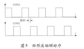 該電路主要由勵(lì)磁時(shí)序發(fā)生單元、三態(tài)緩沖器及隔離光耦組成。勵(lì)磁時(shí)序由電磁海水流量計(jì)系統(tǒng)的控制核心產(chǎn)生。采用DSP的EPWM外設(shè)模塊,通過設(shè)定其內(nèi)部定時(shí)器的工作模式發(fā)出所要求的勵(lì)磁頻率的勵(lì)磁時(shí)序PWM信號(hào)CT_1和CT_2。由于勵(lì)磁控制系統(tǒng)中的勵(lì)磁工作電源的電壓要比DSP的工作電源電壓高得多,為防止勵(lì)磁電路故障對系統(tǒng)控制核心產(chǎn)生致命影響,采用光耦將控制部分與勵(lì)磁部分進(jìn)行隔離。另外,由于DSP引腳的驅(qū)動(dòng)能力有限,所以在DSP與隔離光耦之間加入三態(tài)緩沖器以驅(qū)動(dòng)隔離光耦的輸入級。并且,DSP能夠通過GPIO口控制三態(tài)緩沖器上的使能引腳來使能和禁止勵(lì)磁,以在檢測到電路故障時(shí)迅速關(guān)斷H橋所有橋臂。該勵(lì)磁時(shí)序產(chǎn)生電路通過軟件編程可產(chǎn)生如圖5所示的單頻矩形波。在實(shí)際應(yīng)用中,由于組成H橋的達(dá)林頓三極管與MOS管導(dǎo)通與關(guān)斷的時(shí)間不一致,易在勵(lì)磁方向切換瞬間,產(chǎn)生上下橋臂同時(shí)導(dǎo)通的現(xiàn)象,反映在勵(lì)磁電流波形上為一幅值很高的窄脈沖。該脈沖電流不僅容易引起遲滯比較電路的誤輸出,從而導(dǎo)致高低壓切換電路與電流旁路電路的誤動(dòng)作,而且對恒流控制電路產(chǎn)生沖擊,減小三端穩(wěn)壓芯片的使用壽命,同時(shí)還會(huì)產(chǎn)生EMC電磁干擾,給測量精度帶來影響。所以實(shí)際應(yīng)用時(shí),如圖5所示對方波勵(lì)磁時(shí)序添加死區(qū),可以明顯減小上述現(xiàn)象。