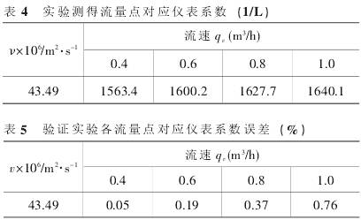 為證明該高粘度變流速自適應(yīng)算法及公式的有效性,重新選取四個(gè)流量點(diǎn):0.4m3/h、0.6m3/h、0.8m3/h、1.0m3/h對該公式以及算法進(jìn)行精度驗(yàn)證,得到表4數(shù)據(jù),表5為各對應(yīng)流量點(diǎn)的擬合后儀表系數(shù)的誤差。