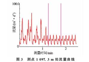 T-××-××1井是大慶油田采油五廠1口水驅(qū)產(chǎn)出井,采用阻抗式含水率計在該井進行了測試。圖3、圖4分別為測點深度1097.3m測量的流量及混相值曲線圖。2min的采樣時間內(nèi),流量及混相值曲線波動劇烈,明顯受井下產(chǎn)氣影響,進行平均值計算時只能取后半段較平穩(wěn)的數(shù)據(jù),因此,測試時需延長測量時間。錄取不同范圍數(shù)值時流量及含水率測量差值較大,流量平穩(wěn)段為14.81m3/d,高值時達到23.52m3/d;取不同測量段的混相值時測量含水率*大相差12%。重復測量得到了相同的測量結(jié)果。由此可見,氣體對流量及含水率測量產(chǎn)生了非常大的測量誤差。