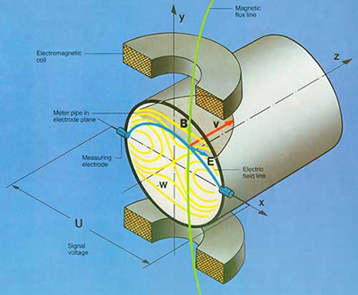 電磁流量計的工作原理是基于法拉*電磁感應(yīng)定律。在測量管內(nèi)的導(dǎo)電介質(zhì)相當(dāng)于法拉*試驗(yàn)中的導(dǎo)電金屬桿,上下兩端的兩個電磁線圈產(chǎn)生恒定磁場。當(dāng)有導(dǎo)電介質(zhì)流過時,則會產(chǎn)生感應(yīng)電壓。管道內(nèi)部的兩個電極測量產(chǎn)生的感應(yīng)電壓。