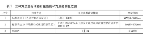 本規(guī)范包含三種校準(zhǔn)方法,分別為標(biāo)準(zhǔn)表法 1(外夾式超聲流量計(jì))、標(biāo)準(zhǔn)表法 2(串聯(lián)移動(dòng)式在線校準(zhǔn)裝置)和稱重法,編制組對每種方法進(jìn)行了大量的實(shí)驗(yàn),并積極與智能電磁流量計(jì)生產(chǎn)廠家及用戶溝通探討,積累了豐富的經(jīng)驗(yàn),獲得了大量的實(shí)驗(yàn)數(shù)據(jù),*終確定三種方法的主標(biāo)準(zhǔn)器計(jì)量性能和對應(yīng)的測量范圍,如表 1 所示。