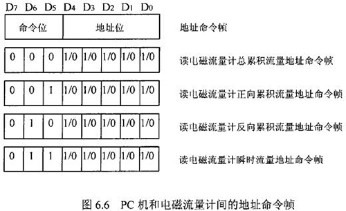 由于RS一485電氣標(biāo)準(zhǔn)規(guī)定每段只能聯(lián)結(jié)犯個節(jié)點(diǎn)設(shè)備,因此可用地址幀中五個二進(jìn)制位表示這32個地址,其余3位用來表示命令,從而構(gòu)成地址命令幀。對于控制命令需求不超過八個的通信系統(tǒng),采用地址命令幀可壓縮報(bào)文長度提高通信效率。在污水網(wǎng)絡(luò)監(jiān)控系統(tǒng)中,分體式電磁流量計(jì)和PC機(jī)通信的主要目的是將流量計(jì)中的有用數(shù)據(jù)讀到PC機(jī)中。這些數(shù)據(jù)包括:總累積流量、正向累積流量、反向累積流量、瞬時流量。通信時,PC機(jī)只需向分體式電磁流量計(jì)發(fā)送讀總累積流量、讀正向累積流量、讀反向累積流量、讀瞬時流量命令即可,因此二者間通信所用的地址幀和命令幀可合二為一,用一個地址命令幀代替。PC機(jī)和分體式電磁流量計(jì)間的地址命令幀定義如圖.66所示。根據(jù)污水網(wǎng)絡(luò)監(jiān)控系統(tǒng)中PC機(jī)與分體式電磁流量計(jì)間通信的特殊性,二者通信所使用的報(bào)文可簡化為圖.67的格式。