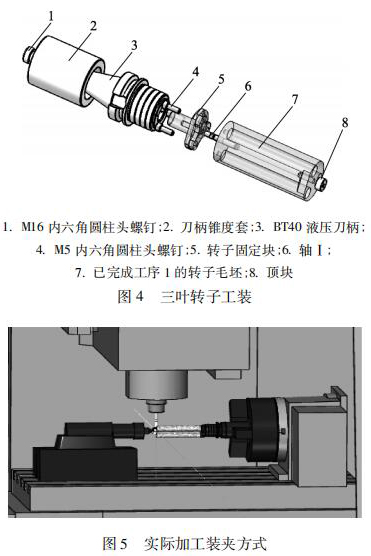 目前量產(chǎn)中的轉(zhuǎn)子都是型材毛坯,采用成型砂輪磨削或者定制成型銑刀進行加工轉(zhuǎn)子曲面。這種加工方式工藝成熟,適合大批量生產(chǎn),而且有利于轉(zhuǎn)子線型的技術(shù)保密,但加工方式在研發(fā)試制中應(yīng)用試制加工周期會很長,而且成本很高,不適合單件或小批量試制。為此,筆者基于四軸立式加工中心,結(jié)合三葉轉(zhuǎn)子加工工藝提出一種工裝,如圖 4所示。將這套工裝定位在立式加工中心四軸回轉(zhuǎn)中心上,加工裝夾方式如圖 5 所示。用機床尾軸頂住轉(zhuǎn)子來增強加工剛性避免切削時產(chǎn)生震顫。