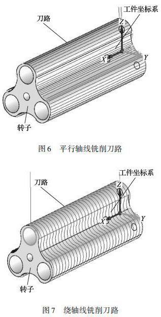 三葉轉(zhuǎn)子的曲面是由多條直線組成的直紋面,加工三葉轉(zhuǎn)子這種高精度的直紋曲面必須采用四軸或五軸聯(lián)動的數(shù)控機床。三葉轉(zhuǎn)子的銑削方式有刀具路徑平行軸線銑削、繞軸線銑削兩種刀具路徑。平行軸線銑削原理為: 刀具在轉(zhuǎn)子曲面上沿 X軸從轉(zhuǎn)子的一端移動到另一端銑出一條直線,銑削下一點位時旋轉(zhuǎn) A 軸 Z 軸聯(lián)動再次從轉(zhuǎn)子一端銑削到另一端,采用往復(fù)銑削直到完成整個轉(zhuǎn)子曲面,刀具路徑如圖 6 所示。繞軸線銑削原理為: 刀具在轉(zhuǎn)子曲面上 AZ 軸聯(lián)動刀具繞 A 軸軸線銑削,銑削下一點位時移動 X 軸,再次 AZ 軸進行聯(lián)動銑削,采用往復(fù)銑削直到完成整個轉(zhuǎn)子曲面,刀具路徑如圖 7 所示。由于繞軸銑削需要 AZ 軸聯(lián)動切削,而數(shù)控機床可以達到的進給率是由*慢的軸決定的,所以,這種刀具路徑在精加工高速銑削時并不適用。