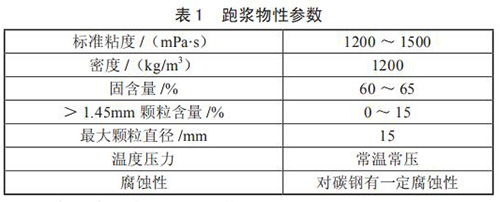 對(duì)跑漿進(jìn)行分析后發(fā)現(xiàn),跑漿是一種由煤漿和一些雜質(zhì)混合而成的半流體物質(zhì),當(dāng)蒸汽流量計(jì)使用煤倉(cāng)中煤堆中上部煤時(shí),由于煤質(zhì)較好,跑漿中小煤塊極少,性質(zhì)同正常煤漿,只是固含量稍高;而使用煤堆底部的煤時(shí),煤質(zhì)差蒸汽流量計(jì)研磨不充分,跑漿中含有約 15% 的小煤塊,分析后的跑漿物質(zhì)參數(shù)如表 1 所示。