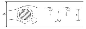 智能渦街流量計(jì)是由漩渦發(fā)生體、頻率檢測(cè)器和信號(hào)轉(zhuǎn)換器等環(huán)節(jié)組成,輸出 4 ~ 20 mADC 信號(hào)或脈沖電壓信號(hào)。其測(cè)量原理是在流動(dòng)的流體中的垂直流動(dòng)方向安放 1 根或多根非流體型阻流體,在一定的流量范圍內(nèi),流體在阻流體兩側(cè)交替地分離、釋放出 2 串頻率正比于管道內(nèi)的平均流速、規(guī)則的、不對(duì)稱(chēng)有規(guī)律的交替漩渦列,如圖 1 所示,且兩側(cè)漩渦旋轉(zhuǎn)方向相反 。采用檢測(cè)元件測(cè)出漩渦頻率就可以推算出流體的流量。