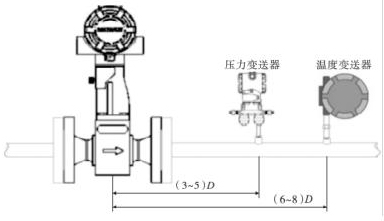 智能渦街流量計(jì)的口徑如果與工藝管道相同,不能滿(mǎn)足流量?jī)x表要求時(shí),或者在此流速下測(cè)量準(zhǔn)確度不能保證時(shí),需要縮小儀表口徑,從而提高管內(nèi)流速,保證測(cè)量精度。上下游必須有足夠的直管段,若傳感器安裝點(diǎn)的上游在同一平面上有 2 個(gè) 90°彎頭時(shí),上游直管段≥25D,下游直管段≥5D。根據(jù)測(cè)量的需要,需在智能渦街流量計(jì)附近測(cè)量壓力和溫度時(shí),測(cè)壓點(diǎn)應(yīng)在傳感器下游的(3 ~5)D 處,測(cè)溫點(diǎn)應(yīng)在傳感器下游的(6 ~8)D 處,如圖 3 所示。