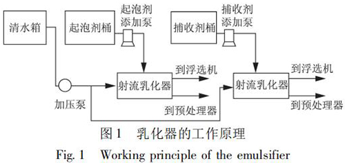 選煤廠浮選藥劑乳化裝置是將藥劑和水制成乳化液,實(shí)現(xiàn)藥劑的合理使用,將對(duì)浮選效果和節(jié)約藥劑起到一定的作用。在使用中可根據(jù)藥劑和水的配制比例觀察藥劑的乳化效果,通過乳化器操作箱內(nèi)的的電位器調(diào)整水泵轉(zhuǎn)速,即調(diào)整乳化壓力。自動(dòng)加藥控制是根據(jù)入浮流量與入浮濃度的檢測(cè)結(jié)果,控制起泡劑與捕收劑的加入。乳化器的工作原理如圖 1 所示。