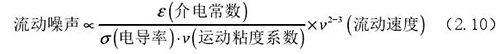 流動(dòng)噪聲主要出現(xiàn)在低電導(dǎo)率流體的檢測中,由輸出端輸出的直流極化電壓時(shí)常出現(xiàn)左右擺動(dòng)的現(xiàn)象,而此種擺動(dòng)的電壓被稱為流動(dòng)噪聲。上式(2.5)中可以觀察了解到流體電導(dǎo)率和流動(dòng)噪聲呈現(xiàn)出負(fù)相關(guān)關(guān)系,由此可以了解到在進(jìn)行低電導(dǎo)率的計(jì)算中需要重點(diǎn)考慮位移電流。