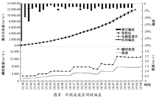 圖 2 的結(jié)果顯示,容積法校驗電磁流量計累計偏差開始階段不穩(wěn)定,后期趨于穩(wěn)定,在 -3. 0%附近。這是測量中不可避免存在某幾個時刻(特別出廠水流量改變時)某些測量點液位波動較大,導(dǎo)致記錄數(shù)值與真實情況存有較大差異,一開始累計出水總量較少,偏差會相對放大,在后期累計水量大,這一原因?qū)е碌钠顪p少,偏差值也趨于穩(wěn)定。
