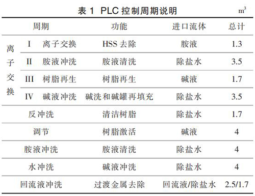 3)調(diào)節(jié)周期。樹脂* 1 次投入使用時(shí),需對(duì)樹脂進(jìn)行“激活”處理。 一般來說,為保持其穩(wěn)定性,新購樹脂通常結(jié)合了 1 個(gè)羥基。 為保證其活性和在陰離子交換柱中的使用,需先使用堿液對(duì)其進(jìn)行“激活”。該周期所產(chǎn)生的廢液送至廢水處理系統(tǒng)。