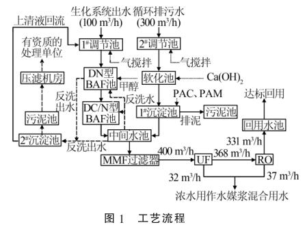 2種廢水在中間水池混勻后,通過(guò)泵提升進(jìn)入保安過(guò)濾器,進(jìn)一步去除細(xì)小的懸浮物后經(jīng)過(guò)增壓泵進(jìn)入超濾膜(UF)處理系統(tǒng)和反滲透(RO)系統(tǒng),然后通過(guò)液體電磁流量計(jì)進(jìn)行計(jì)量。反滲透出水直接進(jìn)入回用水池達(dá)標(biāo)回用,超濾濃水以及反滲透濃水用作水煤漿混合用水。污泥池中的污泥通過(guò)泵打入帶式機(jī)壓濾處理,濾液自流進(jìn)入1#調(diào)節(jié)池。工藝流程見圖1。