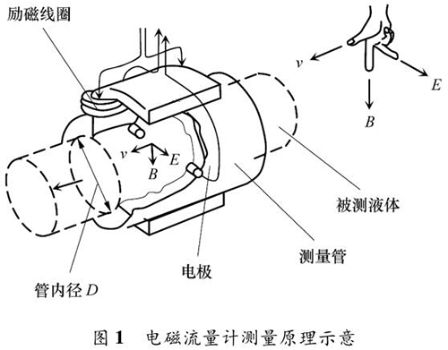 乙醇管道流量計的測量原理如圖 1 所示。根據(jù)法拉*電磁感應定律,導電液體在磁場中流動會產(chǎn)生電動勢 E,它與磁感應強度 B、導電液體平均流速 v 成一定比例關系: