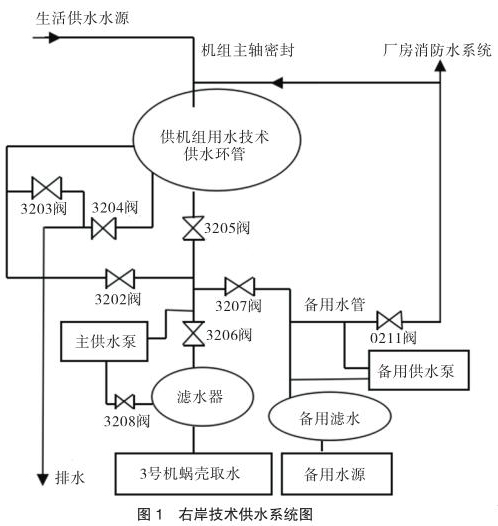大化電廠技術(shù)供水包括右岸和左岸供水,本文以右岸 3 號(hào)機(jī)技術(shù)供水系統(tǒng)增設(shè)帶現(xiàn)場(chǎng)顯示智能型電磁流量計(jì)技術(shù)改造方案為例進(jìn)行分析說(shuō)明。右岸技術(shù)供水系統(tǒng)(見(jiàn)圖 1)由各機(jī)組單元蝸殼取水主水源、濾水器、主供水泵、正反向切換閥(3202 閥與 3204 閥開為反向取水,3203 閥與 3205閥開為正向取水,運(yùn)行時(shí)只開其中一種)、備用水源、備用濾水器、備用供水泵和備用總水管構(gòu)成一個(gè)整體,并通過(guò) 0211 閥與廠房消防水系統(tǒng)相連接,可通過(guò)主水源自流供水、主水源水泵增壓供水、備用水源自流供水、備用水源水泵增壓供水等不同供水方式向機(jī)組推力軸承冷卻器和發(fā)導(dǎo)軸承冷卻器、水導(dǎo)軸承冷卻器、發(fā)電機(jī)空氣冷卻器提供冷卻水源。機(jī)組技術(shù)供水正常運(yùn)行采用單元蝸殼取水的供水方式運(yùn)行,以備用水源供水為輔。機(jī)組主軸密封用水分別取自生活供水水源和技術(shù)供水備用總管水源,向機(jī)組大軸提供可調(diào)水壓端面密封水源。在現(xiàn)場(chǎng)配置一個(gè)技術(shù)供水現(xiàn)地單元柜,實(shí)現(xiàn)對(duì)機(jī)組技術(shù)供水系統(tǒng)設(shè)備自動(dòng)控制、故障保護(hù)及報(bào)警。柜內(nèi)配置可編程 PLC 控制系統(tǒng),電控柜對(duì)主供增壓泵、3202 至 3208 電動(dòng)碟閥進(jìn)行流程控制。