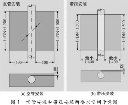 (1)要確認(rèn)在用液體電磁流量計(jì)的管壁厚度及內(nèi)襯材料特性,保證換能器在管段內(nèi)壁的突出長(zhǎng)度;(2)用氣焊切割液體電磁流量計(jì)外殼時(shí),一定要在管道內(nèi)充滿水的情況下(*好是帶壓并繼續(xù)保持管內(nèi)水在運(yùn)行流動(dòng)的狀態(tài))進(jìn)行,以免內(nèi)襯受熱凸起變形影響流態(tài);(3)要有足夠安裝空間(流量井),可以用原有的流量井,但管壁與流量井墻壁*小距離不小于 500 mm,流量井長(zhǎng)不小于 1. 5 倍管徑。超聲波流量計(jì)空管安裝和帶壓安裝要求空間如圖 1 所示。