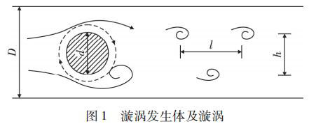 蒸汽流量計(jì)是由漩渦發(fā)生體、頻率檢測器和信號轉(zhuǎn)換器等環(huán)節(jié)組成,輸出 4 ~ 20 mADC 信號或脈沖電壓信號。其測量原理是在流動的流體中的垂直流動方向安放 1 根或多根非流體型阻流體,在一定的流量范圍內(nèi),流體在阻流體兩側(cè)交替地分離、釋放出 2 串頻率正比于管道內(nèi)的平均流速、規(guī)則的、不對稱有規(guī)律的交替漩渦列,如圖 1 所示,且兩側(cè)漩渦旋轉(zhuǎn)方向相反。采用檢測元件測出漩渦頻率就可以推算出流體的流量。