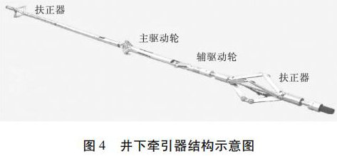 牽引器采用的是 Sondex 公司的牽引器,如圖 4所示。儀器外徑 54 mm,長(zhǎng)度 7.4 m,牽引力 273 kg,耐壓103 MPa,耐溫 150 ℃,牽引速度 540 m/h。牽引器連接于電纜頭和測(cè)井儀器之間。在水平段和造斜段儀器不能靠自重下放,利用牽引器可以將儀器推送到測(cè)井目的層段。井下?tīng)恳饔蓛山M呈 90°交叉分布的驅(qū)動(dòng)臂和扶正器組成。在進(jìn)行井下儀器牽引時(shí),*先打開(kāi)牽引器驅(qū)動(dòng)臂,使驅(qū)動(dòng)臂端部的驅(qū)動(dòng)輪支撐到套管壁并保持足夠的正壓力,然后驅(qū)動(dòng)輪旋轉(zhuǎn)實(shí)現(xiàn)對(duì)儀器的推送。井下儀器牽引過(guò)程可在地面進(jìn)行人工控制,通過(guò)控制命令和調(diào)整供電電壓可控制井下?tīng)恳俣群头较?。該牽引器提供了多種井下測(cè)量參數(shù),包括電纜頭電壓和張力、牽引速度、接箍深度等數(shù)據(jù),所有這些沿井身測(cè)量到的參數(shù)均可在地面顯示出來(lái),使施工具有安全性和可操作性。當(dāng)斷開(kāi)電源時(shí),驅(qū)動(dòng)臂在外力作用下可收回,保證儀器安全取出。