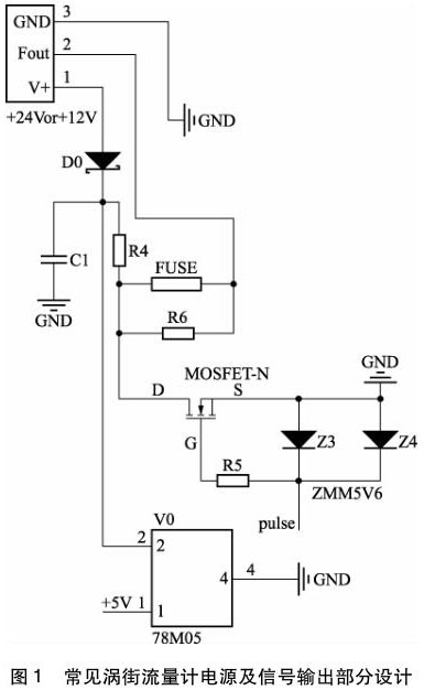 絕大多數(shù)的電磁干擾,都是通過電源線、信號線進入到電子電路內(nèi),同樣,流量計也是如此。圖 1 為常見流量計電源及信號輸出部分設(shè)計。