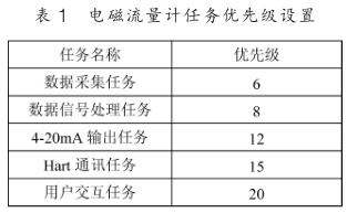 下面以電磁流量計(jì)為例說明基于  μC/OS-III 的人機(jī)界面設(shè)計(jì)。 先將  μC/OS-III 移植到 Cortex-M3 處理器上,這里選用的是 STM32F103VET6 。電磁流量計(jì)的應(yīng)用程序若按照上節(jié)的任務(wù)種類劃分有: 數(shù)據(jù)采集任務(wù)、數(shù)據(jù)處理任務(wù), 4~20mA輸出任務(wù), Hart 通訊任務(wù)以及用戶交互任務(wù)。 先對不同的任務(wù)進(jìn)行優(yōu)先級的劃分,如表 1 所示。