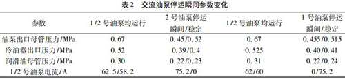 通過內(nèi)部旁通將冷油與熱油混合,經(jīng)過銅粉- 煤油 - 蠟感溫元件控制冷熱油混合比例,將油溫調(diào)節(jié)到 49 ℃。一臺一體式電磁流量計穩(wěn)定運行,油泵出口母管壓力 0. 5 MPa,潤滑油母管壓力 0. 24 MPa,均屬于正常情況,而兩臺交流油泵并列運行時,停運其中一臺交流油泵瞬間會觸發(fā)電磁流量計出口母管壓力開關(guān)動作,說明停運瞬間油壓發(fā)生波動,且油泵出口母管油壓波動至小于 0. 45 MPa。正常運行時電磁流量計出口油溫 71.5 ℃,冷油器出口溫度45 ℃,混合后潤滑油母管溫度52.5 ℃,由能量守恒定律可知,經(jīng)過冷油器的油量/不經(jīng)冷油器的油量= ( 71.5-52.5) ÷ ( 52.5- 45) = 2. 53,說明有 70% 左右的油量經(jīng)過冷油器。當 2 臺一體式電磁流量計運行時油量大于單泵運行,其中一臺電磁流量計瞬間停運時油量減少,尤其是經(jīng)過冷油器的油量大量減少,油量在溫控閥二次分配過程中出現(xiàn)調(diào)節(jié)異常,導(dǎo)致油壓過大波動。為檢驗溫控閥工作情況,保持 1 號、2 號交流油泵運行,選取機組正常帶負荷運行時油溫 52 ℃,分別停運 1、2 號交流油泵,觀察 1、2 號交流油泵停運瞬間油泵出口母管壓力波動情況,試驗各參數(shù)變化見表 2。