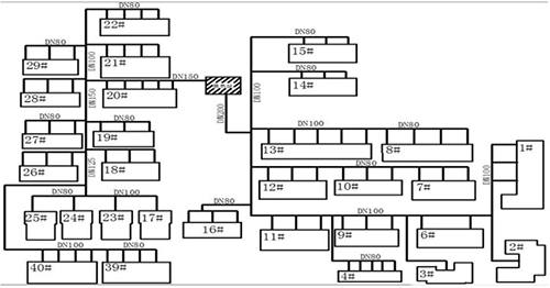 某小區(qū)住宅樓建設(shè)于1996年,建筑結(jié)構(gòu)為磚混建筑,建筑面積為54931m2,共30棟住宅樓。2017年繳費(fèi)739戶(hù),總采暖面積為47141m2。換熱站位于小區(qū)中部,板式換熱機(jī)組設(shè)計(jì)換熱面積為50000m2,循環(huán)泵額定功率為30kW,流量為200m³/h,揚(yáng)程為32m。庭院管網(wǎng)共分為2個(gè)支狀供回水環(huán)路,該小區(qū)供熱管網(wǎng)見(jiàn)圖1所示。