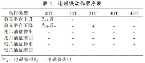 改進(jìn)后液壓系統(tǒng)工作原理:通過溢流閥調(diào)整剪叉油缸工況所需壓力,通過疊加溢流閥來調(diào)整托爪和鎖爪工況所需壓力。 剪叉平臺(tái)上升(剪叉油缸縮回)或下降(剪叉油缸伸出)時(shí) 0DT 先得電,當(dāng)剪叉油缸到位后 0DT 失電,大泵供油無壓流回油箱。 通過電磁換向閥 17(1DT 和 2DT 的得失電)來控制剪叉油缸的伸出或縮回,通過電磁換向閥 18(3DT 和4DT 的得失電)來控制托爪和鎖爪的伸出和縮回。改進(jìn)后液壓系統(tǒng)的電磁鐵動(dòng)作順序如表 1 所示。