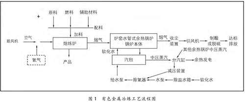 在有色金屬冶煉過程中,將原料、燃料和輔助材料根據(jù)熱平衡原理按一定比例進(jìn)行配料,配料后的物料與空氣或高含氧的混合空氣在熔煉爐中進(jìn)行氧化或還原反應(yīng),熔煉出有色金屬產(chǎn)品。同時(shí),在熔煉過程中會產(chǎn)生大量的高溫?zé)煔猓?1200 ℃ 左右),高溫?zé)煔饨?jīng)過余熱鍋爐時(shí),與余熱鍋爐水側(cè)的軟化水進(jìn)行熱量交換,煙溫迅速降至 250℃ 以下,再經(jīng)收塵、制酸或脫硫裝置進(jìn)一步收塵、降溫、凈化,*終達(dá)標(biāo)排放。余熱鍋爐水側(cè)的軟化水經(jīng)熱量交換后產(chǎn)生中壓飽和蒸汽(4 MPa 左右),送至余熱發(fā)電機(jī)組發(fā)電。具體的工藝流程如圖 1 所示。