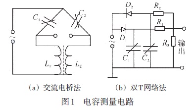 差壓液位變送器的測量電路如圖1所示,變送器的輸出可以轉(zhuǎn)換成電壓、電流或頻率等信號,然后放大。圖1(a)的交流電橋法是將兩個電容器接于交流電橋的兩個相鄰臂上,交流電橋的輸出經(jīng)放大與相敏檢波后進行測量。圖1(b)的雙T網(wǎng)絡法壓差引起的電容變化轉(zhuǎn)換成電壓變化輸出。在交流電源正半周時,通過二極管D1對電流器C1進行充電,在負半周時,電容器C1經(jīng)電阻R1與R3進行對地放電;而電容器C2 則在電源的負半周充電、正半周對R3 與R2 反向放電。因此R3上兩端的電壓輸出是由C1與C2的平均放電電流之差所決定的。當壓差為零時,C1、D1、R1與C2、D2、R2的參數(shù)相同,則通過R3的平均放電電流之差為零。當壓差不等于零時,差動電容C1與C2一個增大一個減小,使兩者的平均放電電流不相等,因此R3兩端的電壓輸出也就有了相應的變化。