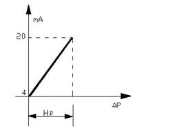 以電動(dòng)差壓變送器為例,當(dāng)液位H為O時(shí),差壓變送器輸出的信號(hào)應(yīng)為4 mA,當(dāng)液位H為*高液位時(shí),差壓變送器輸出的信號(hào)應(yīng)為20 mA,這是一種比較理想狀態(tài)。從圖1可見(jiàn),當(dāng)被測(cè)介質(zhì)的密度為ρ,容器中液體以上部分的氣相并不會(huì)凝結(jié)成冷凝液,這時(shí)作用于變送器正負(fù)壓室的差壓應(yīng)為:△Р= Hρ。其曲線(xiàn)如圖2所示: