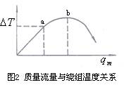 在總的熱傳導(dǎo)系數(shù)a中,因測量管壁很薄且具有相對較高熱導(dǎo)率,儀表制成后其值不變,因此a的變化可簡化認為主要是流體邊界層熱導(dǎo)率的變化。當使用于某一特定范圍的流體時,則a、cp均視為常量,則質(zhì)量流量僅與繞組平均溫度差成正比,如圖2 oa 段所示。 oa段為儀表正常測量范圍,儀表出口處流體不帶走熱量,或者說帶走熱量極微;超過a點流量增大到有部分熱量被帶走而呈現(xiàn)非線性,流量超過b點則大量熱量被帶走。