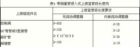 2) 浸入式 帶測量管的浸入式流量傳感器和插入式儀表需要一定長度前置直管段,iso/dis 14511對此未作具體規(guī)定,而按制造廠建議的值。bs 7405建議對于在管道中用插入熱絲流速計時,需要(8~10)d的上游直管段和(3~5)d的下游直管段。表4列舉sierra公司對帶測量管浸入式tmf所規(guī)定的上直管段長度;若在其進口端裝一塊或二快多孔板式流動調(diào)整器(整流器)后,則其長度可大為縮短,如表*右列所示。