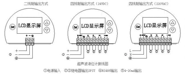 智能超聲波液位計具有三種輸出方式,在進(jìn)行接線時,請按照下圖所示的接線方式進(jìn)行安全接線。