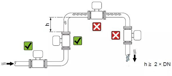 管路必須完全充滿液體。保證管路始終充滿液體至關重要,否則流量顯示會受到影響,而且還會出現(xiàn)測量錯誤。管路結(jié)構(gòu)的設計必須要保證測流管始終充滿流體。當流體有分流或含有固體顆粒沉淀物時,建議使用垂直安裝。但采用垂直安裝時,要遵循流體從下到上的走向,以保證管路充滿流體。
