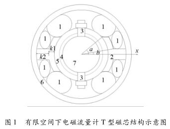 T型磁芯是為較小的空間下實(shí)現(xiàn)盡可能大的勵(lì)磁線圈而提出的,如圖1所示為較小空間結(jié)構(gòu)下,設(shè)計(jì)有T型磁芯的井水流量計(jì)傳感器截面圖。在圖中1表示線圈位置;2表示磁芯位置;3表示電極及其固定器件位置;4表示襯里位置;5表示內(nèi)徑壁位置;6表示外徑壁;7表示測(cè)量管道(測(cè)量區(qū)域)。如圖1所示井水流量計(jì)勵(lì)磁結(jié)構(gòu)磁芯造型近似為T(mén)型(因稱為T(mén)型磁芯),磁芯在靠近井水流量計(jì)內(nèi)管道時(shí)為T(mén)型磁芯的較長(zhǎng)端。如圖中所示,T型磁芯較長(zhǎng)端與x軸夾角為a,T型磁芯較短端與x軸夾角為b,T型磁芯較長(zhǎng)端寬度為k1,T型磁芯較短端寬度為k2。