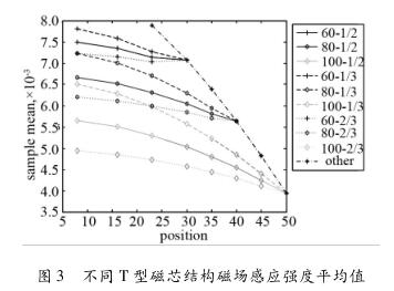 如圖3所示為不同T型磁芯結(jié)構(gòu)下測(cè)量區(qū)域產(chǎn)生磁場(chǎng)感應(yīng)強(qiáng)度平均值,圖中橫坐標(biāo)為T(mén)型磁芯b的角度,縱坐標(biāo)為測(cè)量區(qū)域的平均磁場(chǎng)強(qiáng)度,圖標(biāo)表示的是T型磁芯的不同a的角度以及磁芯長(zhǎng)端寬度所占的比例。其中以“角度-比例”表示,例如30-1/2表示T型磁芯的較長(zhǎng)端角度a為30°,k1/(k1+k2)為1/2時(shí)的測(cè)量區(qū)域中平均磁場(chǎng)強(qiáng)度測(cè)量結(jié)果。圖標(biāo)Other為T(mén)型磁芯較長(zhǎng)端的角度a與較短端的角度b相等(即為23,30,35,40,45,50)時(shí)的流量計(jì)測(cè)量區(qū)域中的平均磁場(chǎng)強(qiáng)度。從仿真結(jié)果可以看出:T型磁芯的較長(zhǎng)端的角度a越小,流量計(jì)測(cè)量區(qū)域中平均磁場(chǎng)強(qiáng)度越大;在T型磁芯的較長(zhǎng)端的角度a一定時(shí),T型磁芯的較短端的角度b越小,流量計(jì)測(cè)量區(qū)域中平均磁場(chǎng)強(qiáng)度越大;在T型磁芯的較長(zhǎng)端的角度a與較短端的角度b一定時(shí),T型磁芯的k1/(k1 + k2)越小,在流量計(jì)測(cè)量區(qū)域中平均磁場(chǎng)強(qiáng)度越大。