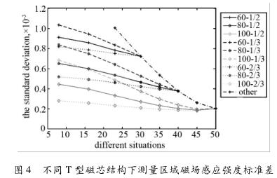 如圖4所示為不同T型磁芯結(jié)構(gòu)下測(cè)量區(qū)域產(chǎn)生磁場(chǎng)感應(yīng)強(qiáng)度標(biāo)準(zhǔn)差,圖中橫坐標(biāo)為T(mén)型磁芯b的角度,縱坐標(biāo)為測(cè)量區(qū)域磁場(chǎng)強(qiáng)度的標(biāo)準(zhǔn)差,圖標(biāo)圖例與圖3中一致。從仿真結(jié)果可以看出:T型磁芯的較長(zhǎng)端的角度a越小,流量計(jì)測(cè)量區(qū)域中磁場(chǎng)強(qiáng)度標(biāo)準(zhǔn)差越大;在T型磁芯的較長(zhǎng)端的角度a一定時(shí),T型磁芯的較短端的角度b越小,流量計(jì)測(cè)量區(qū)域中磁場(chǎng)強(qiáng)度標(biāo)準(zhǔn)差越大;在T型磁芯的較長(zhǎng)端的角度a與較短端的角度b一定時(shí),T型磁芯的k1/(k1 + k2)越小,在流量計(jì)測(cè)量區(qū)域中磁場(chǎng)強(qiáng)度標(biāo)準(zhǔn)差越大。