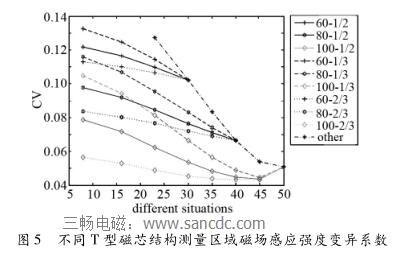 標(biāo)準(zhǔn)差代表磁場(chǎng)測(cè)量區(qū)域的磁場(chǎng)分布波動(dòng)性較大,因而需引入變異系數(shù)對(duì)測(cè)量區(qū)域中的磁場(chǎng)分布情況進(jìn)一步分析。如圖5所示為不同T型磁芯結(jié)構(gòu)下測(cè)量區(qū)域磁場(chǎng)感應(yīng)強(qiáng)度變異系數(shù),圖中橫坐標(biāo)為T(mén)型磁芯b的角度,縱坐標(biāo)為測(cè)量區(qū)域磁場(chǎng)強(qiáng)度分布的變異系數(shù),圖標(biāo)圖例與圖3中一致。從仿真結(jié)果可以看出:T型磁芯的較長(zhǎng)端的角度a越小,流量計(jì)測(cè)量區(qū)域中磁場(chǎng)強(qiáng)度變異系數(shù)越大;在T型磁芯的較長(zhǎng)端的角度a一定時(shí),T型磁芯的較短端的角度b越小,流量計(jì)測(cè)量區(qū)域中磁場(chǎng)強(qiáng)度變異系數(shù)越大;在T型磁芯的較長(zhǎng)端的角度a與較短端的角度b一定時(shí),T型磁芯的k1/(k1 + k2)越小,在流量計(jì)測(cè)量區(qū)域中磁場(chǎng)強(qiáng)度變異系數(shù)越大。異系數(shù)越大說(shuō)明磁場(chǎng)分布越不均勻,波動(dòng)性越大;異系數(shù)越小說(shuō)明磁場(chǎng)分布趨向均勻。下面通過(guò)計(jì)算測(cè)量區(qū)域中的磁場(chǎng)均勻區(qū)域來(lái)對(duì)這一結(jié)果進(jìn)一步的分析。