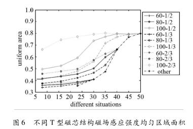 仿真實(shí)驗(yàn)證明在有限的空間下,修改T磁芯的不同參數(shù),可以增加流量計(jì)測(cè)量區(qū)域內(nèi)部的磁場(chǎng)分布情況,也可以適當(dāng)?shù)恼{(diào)整流量計(jì)測(cè)量區(qū)域中的磁場(chǎng)強(qiáng)度與均勻度,根據(jù)生產(chǎn)測(cè)井中的實(shí)際工況,改變井水流量計(jì)的T磁芯參數(shù)獲得設(shè)計(jì)參數(shù)。