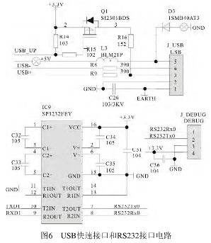 由Q1、R14、R15、R16、L3、D3、R8和R9等元件組成的電路與單片機對應電路,組成等元件組成的電路與單片機對應電路,組成USB快速接口電路??焖俳涌陔娐贰C9(SP3232EEY)芯片與周圍元)芯片與周圍元件組成RS232接口電路。電路如圖6所示。