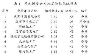 根據(jù)化工污水流量計(jì)選型的校驗(yàn)標(biāo)準(zhǔn),撫順市安裝的化工污水流量計(jì)選型運(yùn)行比較正??勺鰧?duì)比試驗(yàn)的有14臺(tái),對(duì)這14臺(tái)流量計(jì)分別進(jìn)行了對(duì)比試驗(yàn)。測(cè)試方法是采用標(biāo)準(zhǔn)儀器對(duì)所監(jiān)測(cè)的流量計(jì)進(jìn)行8h的連續(xù)平行監(jiān)測(cè),從試驗(yàn)結(jié)果中選出被檢流量計(jì)*大流量范圍的五點(diǎn)對(duì)比數(shù)據(jù)和累計(jì)流量對(duì)比結(jié)果,相對(duì)誤差小于5%的為合格。此次實(shí)際測(cè)試的有:撫順縣化肥廠、北方化工廠、撫順?biāo)喙煞萦邢薰?、遼寧能港發(fā)電廠、醇醚化工廠、遼寧華豐化工廠、天湖啤酒有限公司、腈綸化工廠8家企業(yè)。飛利鋁材、汽車鋁輪轂、老虎臺(tái)礦、石油一廠新廠因?yàn)闊o(wú)水未測(cè)試,石油二廠新排污口、乙烯化工廠因?yàn)槿鄙倭髁坑?jì)廠方配合未能測(cè)試。測(cè)試結(jié)果除華豐化工廠流量計(jì)相對(duì)誤差大于5%不合格外,其他均合格,見(jiàn)表1。